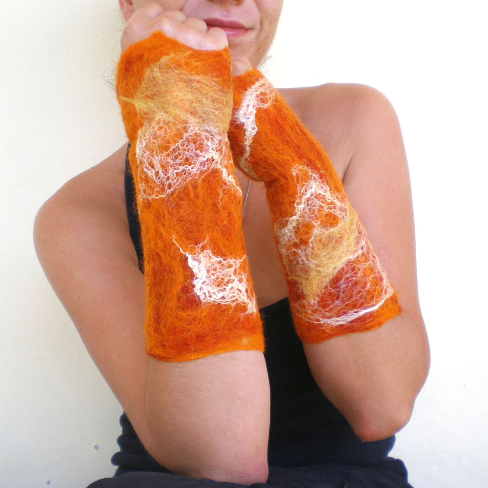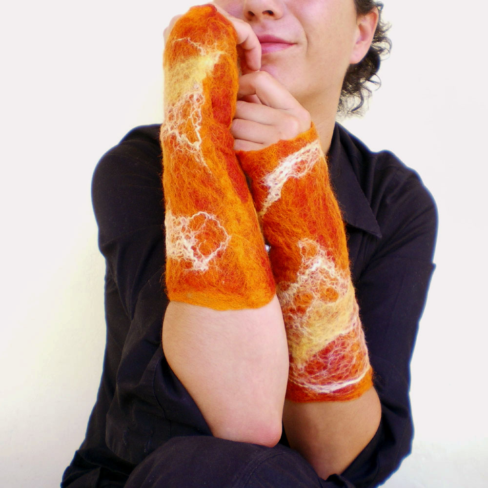 This pair of arm warmers is made of Australian and New Zealander extra-fine merino wool in orange, deep red, red and yellow colours. Additionally mulberry silk threads in blonde yellow are used to decorate them and to offer a shiny effect. Their edges are uneven and they can be worn inside out; one side covered with the patterning that you see on the photos and the other simply with green wool. They can be worn till the middle part of the hand as half gloves.