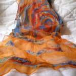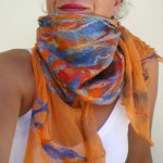 This nuno-felted scarf consists of chiffon silk (100%) in orange colour and extra-fine (18 mic) merino wool from Australia and New Zealand in a punch of colours; blue, light blue, red, orange, blonde yellow and yellow. Additionally extra fine mulberry silk threads in blonde yellow and light blue are used in order to offer a shiny effect which adopts different hues depending on the natural light. The orange chiffon silk is used as a basis for the scarf and the wool is applied on the top in order to create the patterning.
