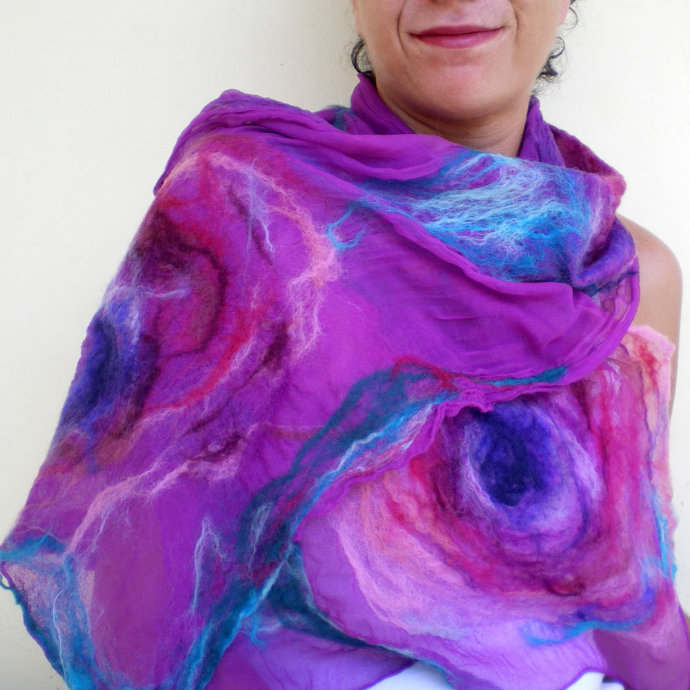 The scarf is created with the wet felting technique. The distinction between this nuno-felted scarf and a simple felted item is that it contains also a different material except from wool, i.e. silk. It measures approximately 167 cm (65.7in) length and 35-42 cm (13.8-16.5in) width.