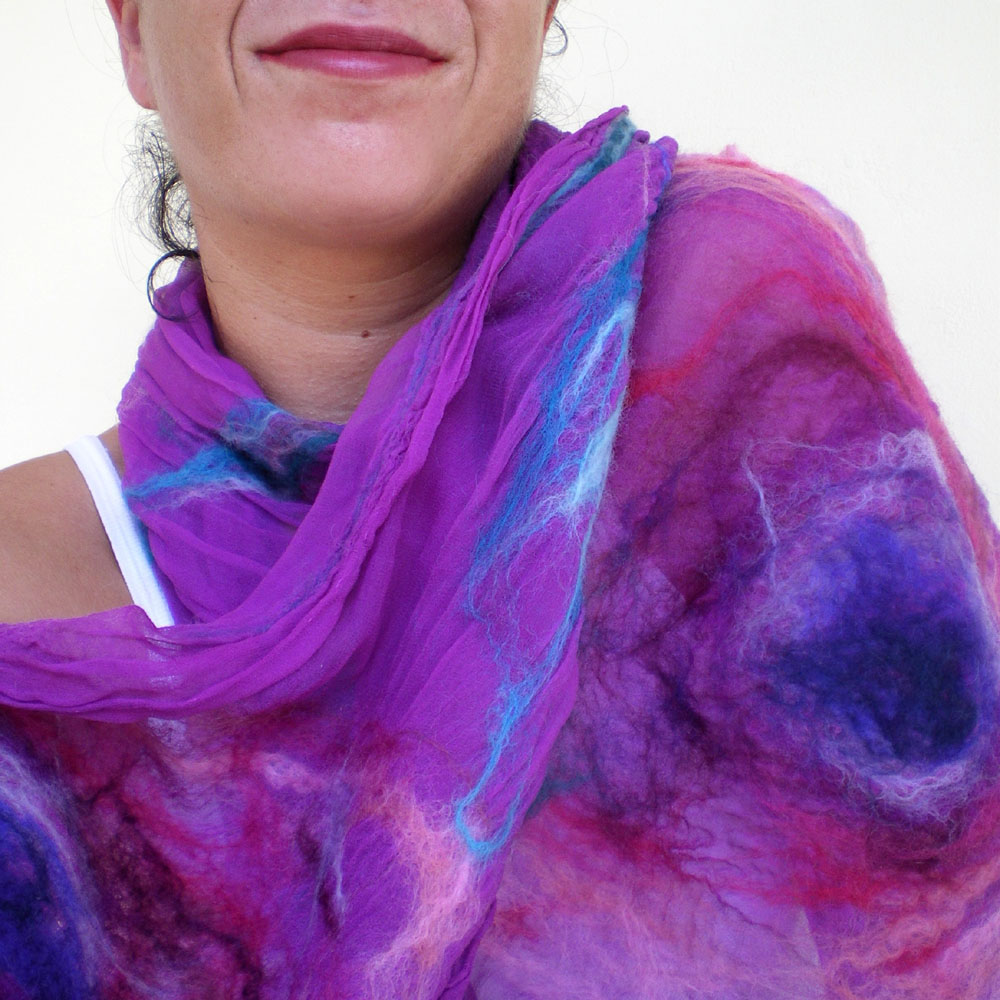 This nuno-felted scarf consists of chiffon silk (100%) in lilac colour and extra-fine (18 mic) merino wool from Australia and New Zealand in a punch of colours; violet, purple, lilac, turquoise, pink, blue, green and black colours! Additionally extra fine mulberry silk threads in black are used in order to offer a shiny effect which adopts different hues depending on the natural light. The lilac chiffon silk is used as a basis for the scarf and the wool is applied on the top in order to create the patterning.