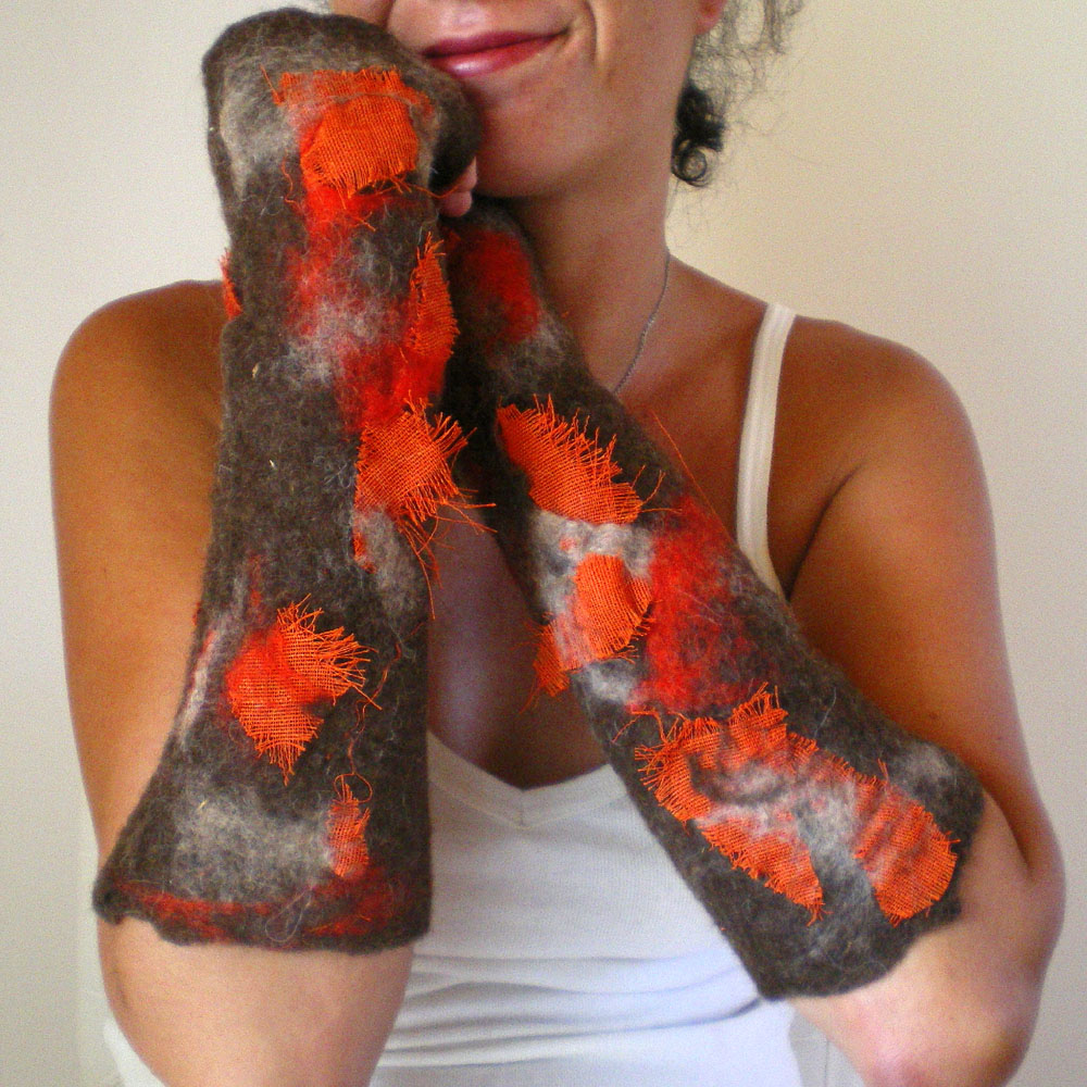 They are felted all together using the wet felting technique and the result that you see in the photos is called nuno-felting. The distinction between this pair of nuno-felted arm warmers and a simple wet-felted item is that it contains also a different material except from wool, i.e. cotton and synthetic fabric. Their edges are uneven from both sides and they can be worn till the middle part of the hand as half gloves. On the other edge they reach the elbow.