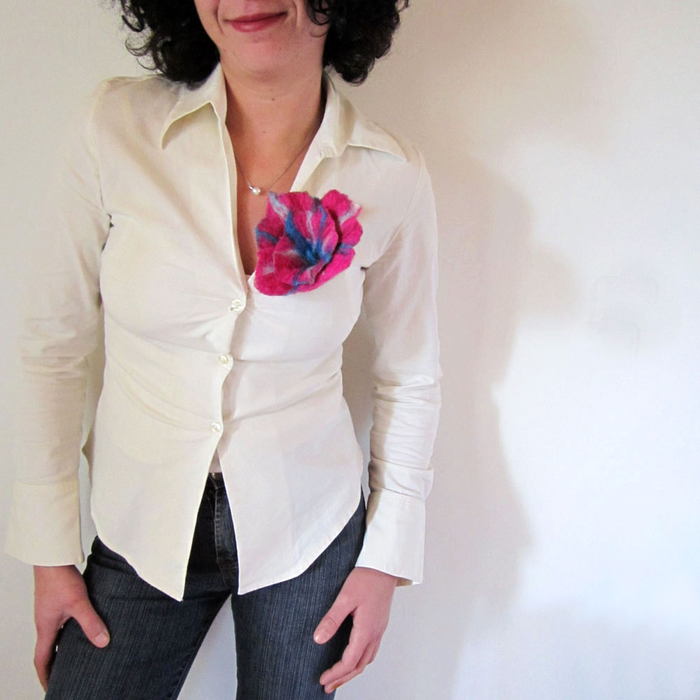 A safety pin is adjusted on the back of the flower and felted over with green wool. The flower measures approximately 14 cm (5.5 in) diameter and 38 cm (15 in) circumference.