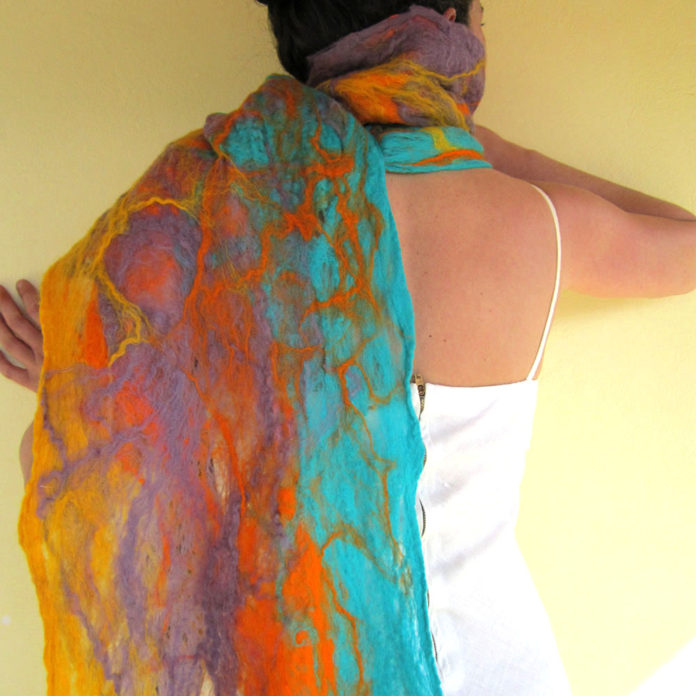This breezy and loose scarf is made with the cobweb felt technique. Most of its parts are transparent with some small holes, creating a fascinating effect. This is what makes unique the cobweb felting technique!