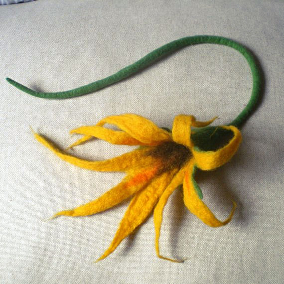 This lovely sun flower is felted with merino wool from New Zealand in yellow, brown, orange and green colours. The flower measures approximately 30 cm (11,8 in) diameter and its stalk 42 cm (16,5 in) length.