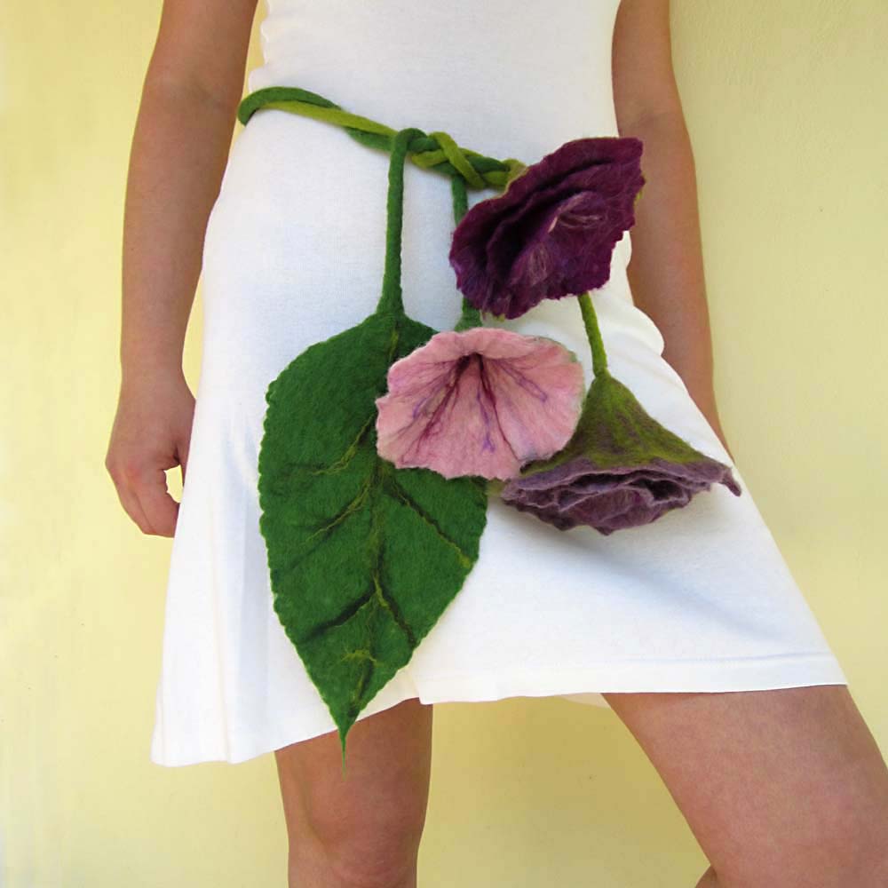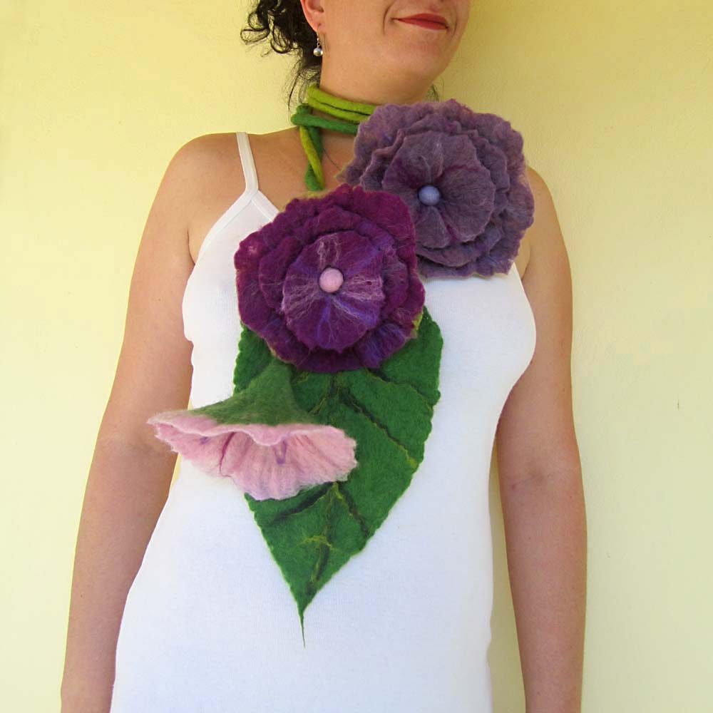 The necklace consists of 3 felted flowers and a leaf in a variety of colors. All of them are hand felted using the wet felting technique with extra-fine merino wool from Australia and South America (18-23 mic). The colors range from violet to white including purple, pink, lilac, strawberry and the two stalks are made in leaf green and apple green colors.