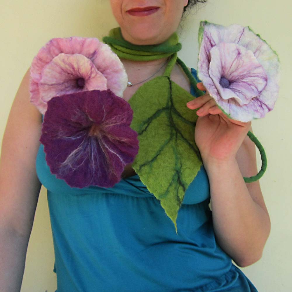 The necklace consists of 3 felted flowers and a leaf in a variety of colors. All of them are hand felted using the wet felting technique with extra-fine merino wool from Australia and South America (18-23 mic). The colors range from violet to white including purple, pink, lilac and the two stalks are made in leaf green and apple green colors.