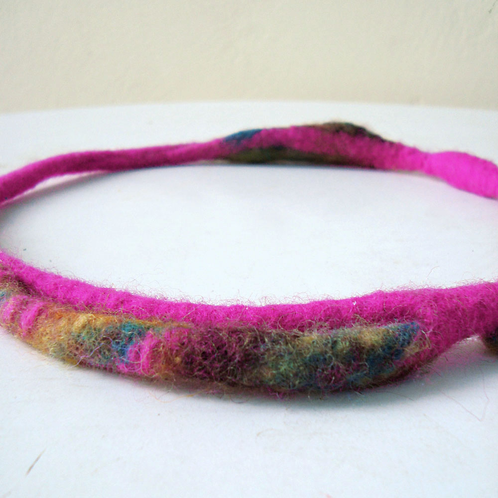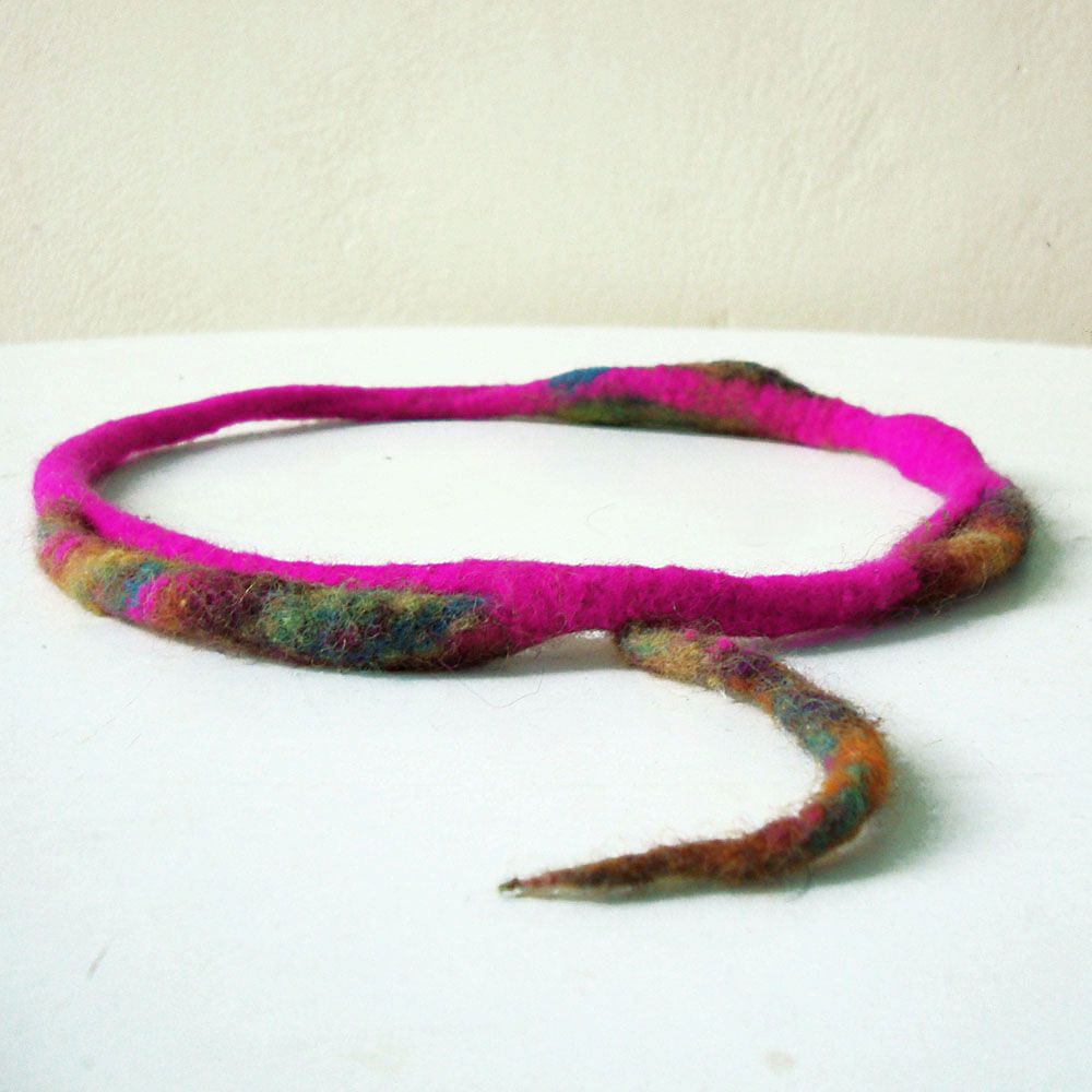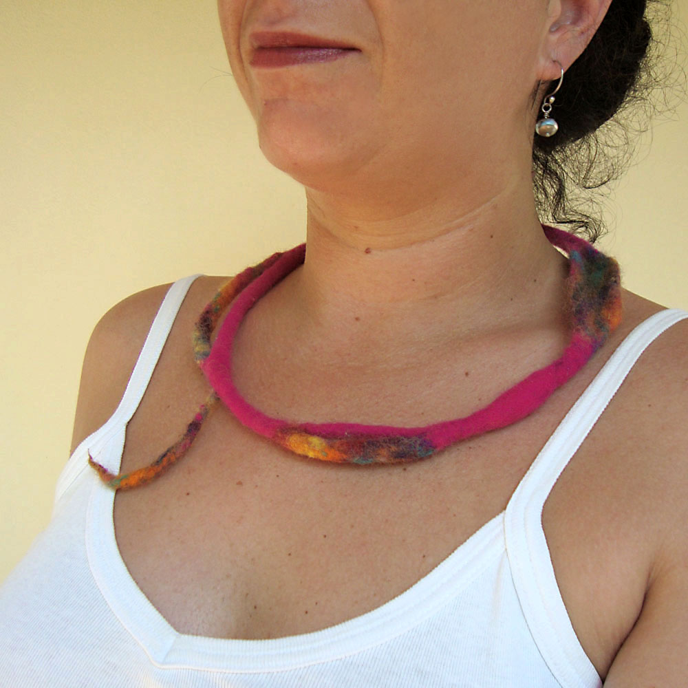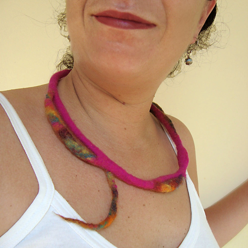 The -fuchsia Fall- necklace is felted from extra-fine merino wool (18 mic) from Australia ranging from fuchsia to green and yellow. It measures approximately 20 cm (7.9 in) diameter and 65 cm (25.6 in) circumference.