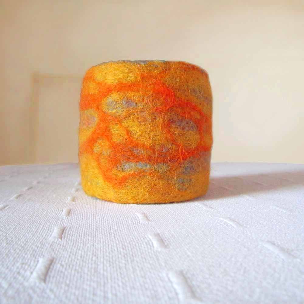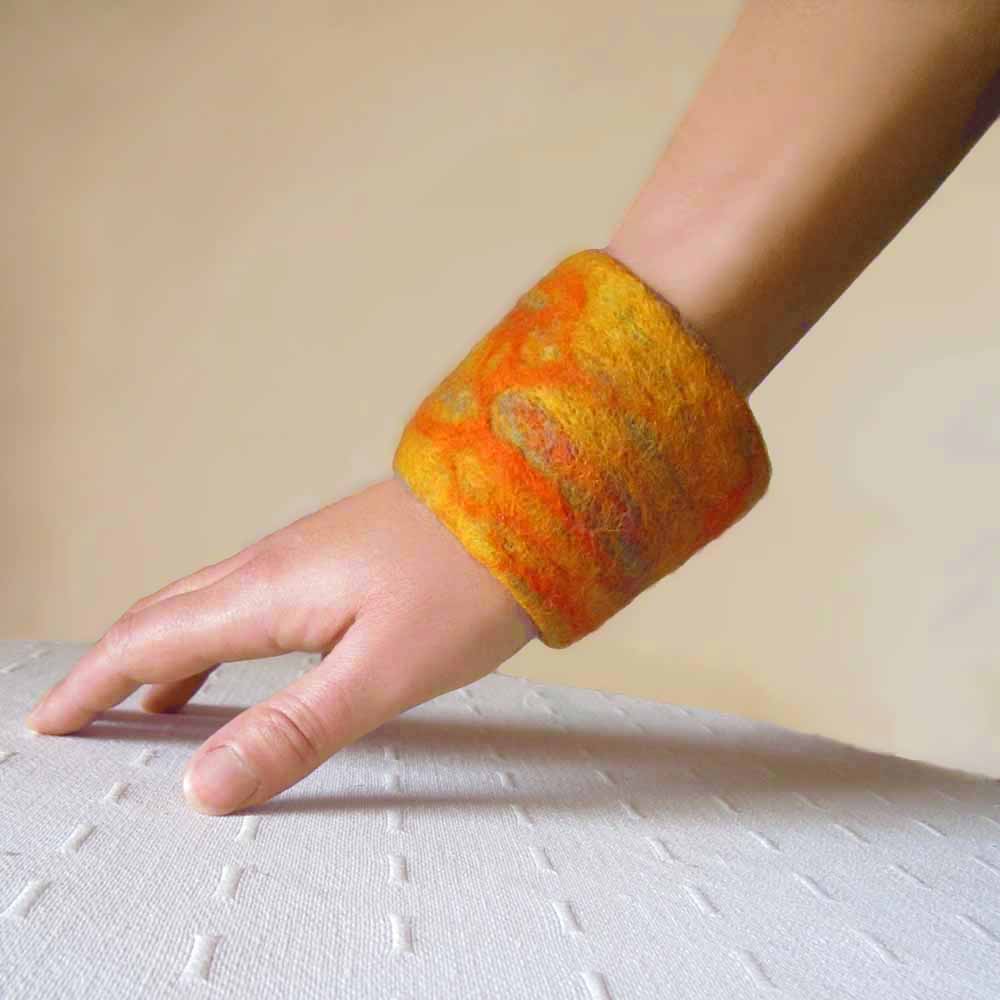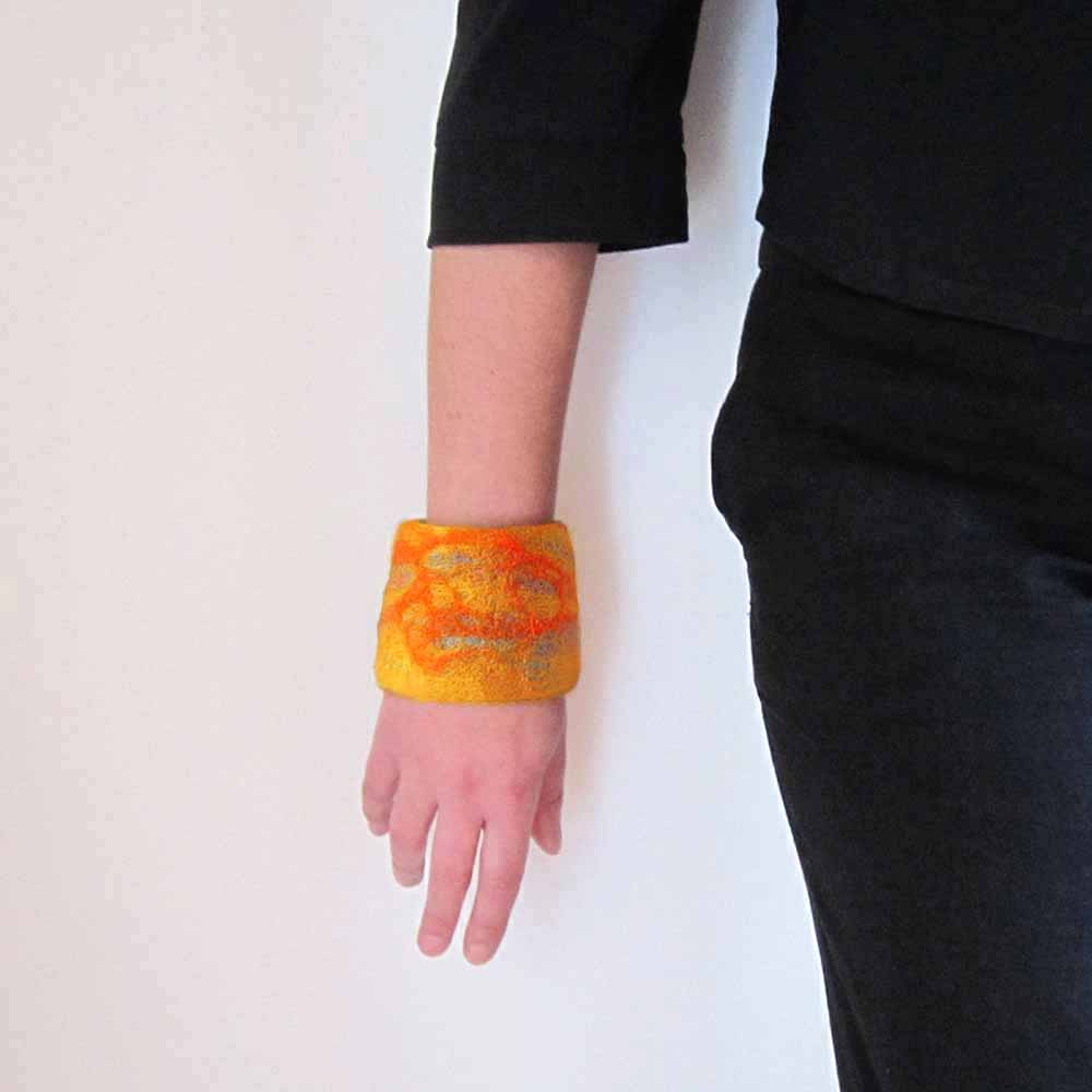 This cuff-bracelet is made of extra-fine merino wool from New Zealand and Australia in orange, yellow and grey colors. It measures approximately 7.5cm (3 in) diameter, 22 cm (8.7 in) inside circumference and width 8 cm (3.2 in). The widest part around the model’s hand is 23 (9.1 in) and her wrist is 17 cm (6.7 in). However the wool is stretchy and can fit over most women’s hands.