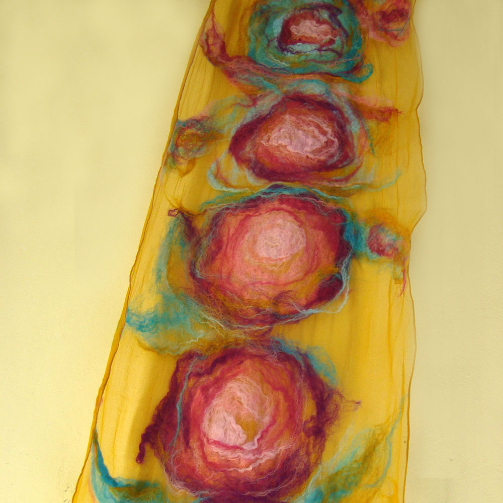 This nuno-felted scarf consists of chiffon silk (100%) in purple colour and extra-fine (18 mic) merino wool from Australia and New Zealand in a punch of colours; violet, purple, lilac, pink, rosa, teal, blue-green, turquoise, aquamarine and mustard! The mustard chiffon silk is used as a basis for the scarf and the wool is applied on the top in order to create the patterning.