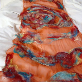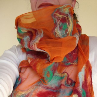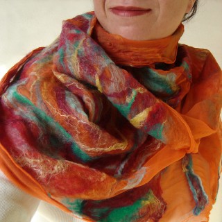This nuno-felted scarf consists of chiffon silk (100%) in orange color and extra-fine (18 mic) merino wool from Australia and New Zealand in a punch of colours; red, yellow, blonde, teal, blue-green, turquoise, aquamarine and orange! Additionally extra fine mulberry silk threads in blonde yellow and dark red are used in order to offer a shiny effect which adopts different hues depending on the natural light.