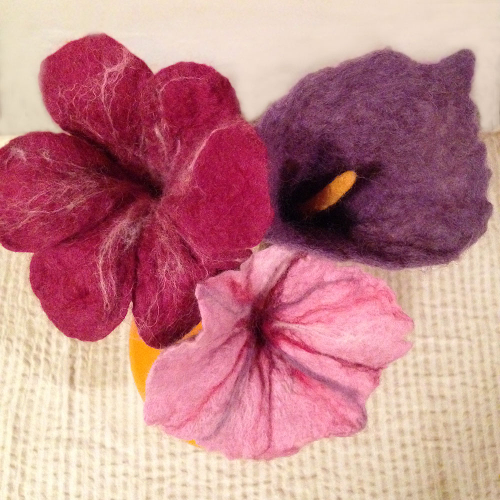 The bouquet consists of 3 felted flowers in a variety of colors, they are part of a bridal bouquet. All of them are hand felted using the wet felting technique with extra-fine merino wool from Australia and South America. The colors range from violet to white including purple, pink, lilac, and their stalks are made in leaf green and apple green colors.