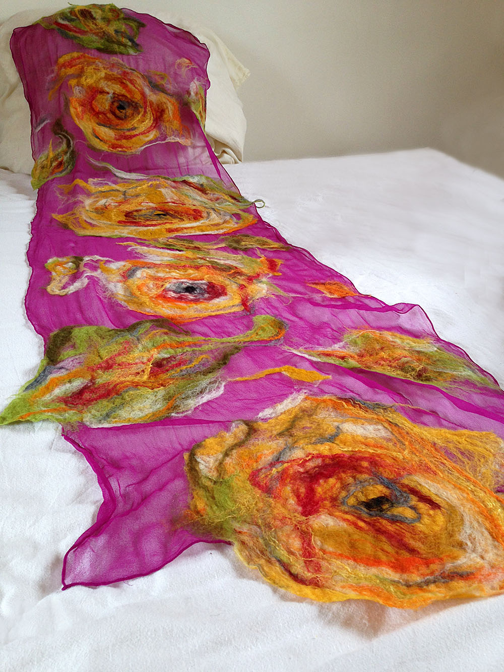 This nuno-felted scarf consists of chiffon silk (100%) in purple colour and extra-fine (18 mic) merino wool from Australia and New Zealand in a punch of colors; purple, mustard, yellow, orange, red, grass green and green! Additionally extra fine mulberry silk threads in red, orange and yellow are used in order to offer a shiny effect which adopts different hues depending on the natural light. The purple chiffon silk is used as a basis for the scarf and the wool is applied on the top in order to create the patterning.