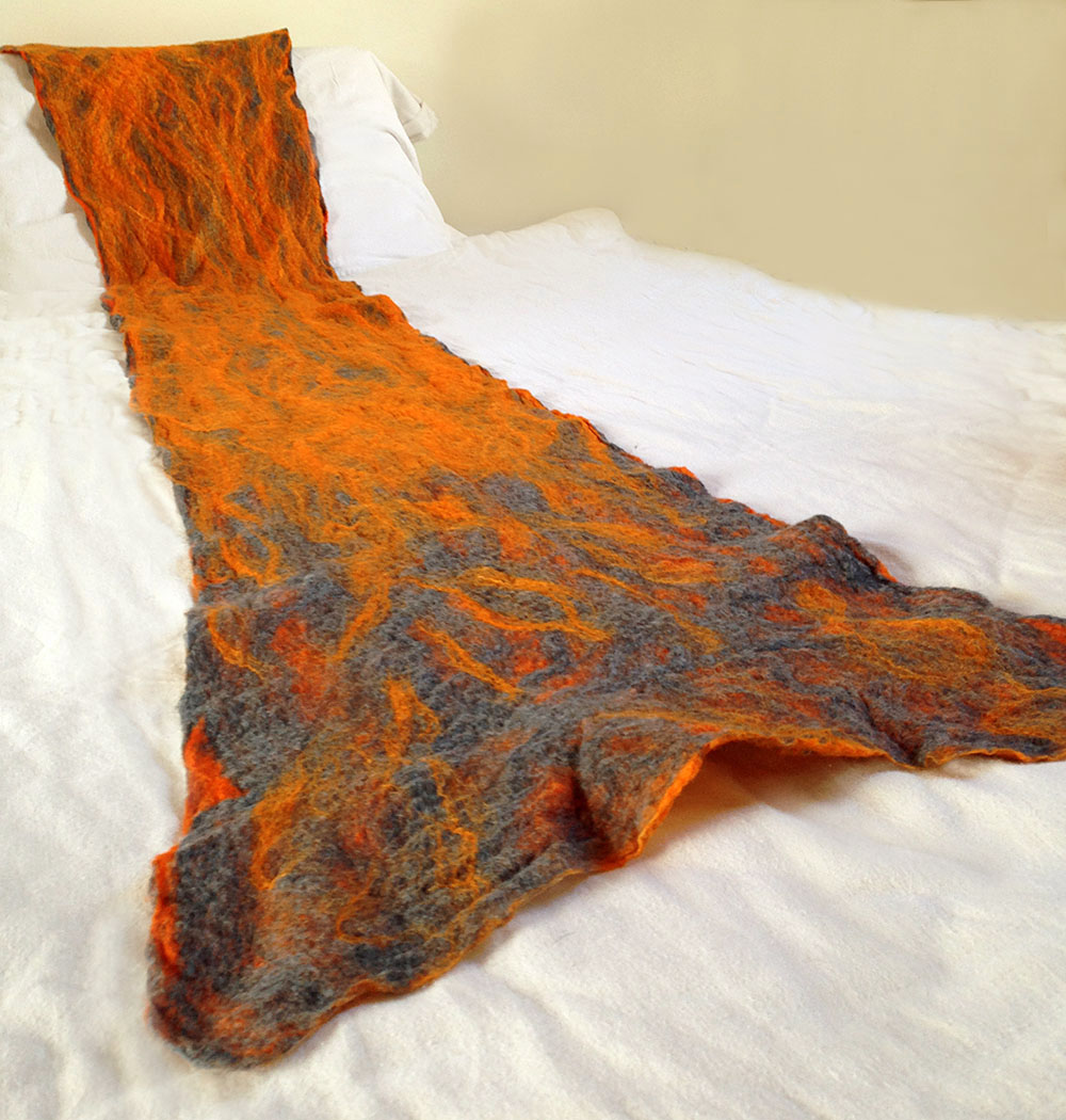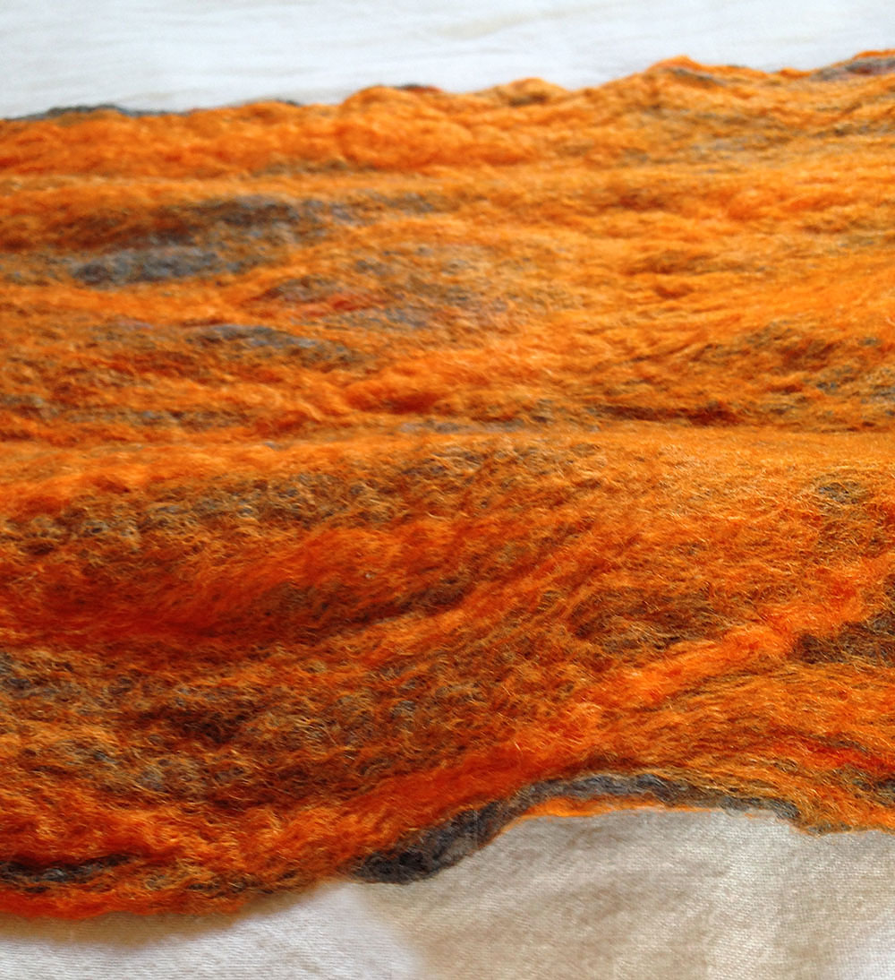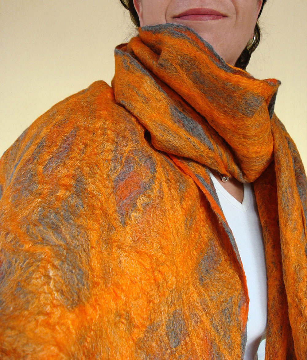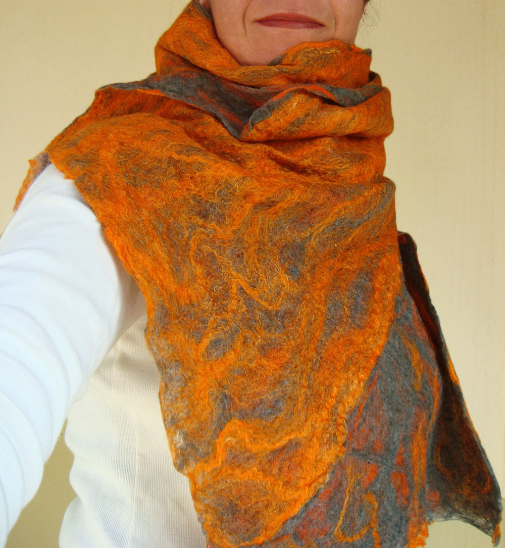 For the scarf is used extra-fine merino wool (18 mic) from Australia and New Zealand in orange and gray colors. Additionally a large quantity of tussah silk threads again in orange are used in order to offer a shiny effect which adopts different hues depending on the natural light. The scarf is double-felted and has similar pattern on both sides.