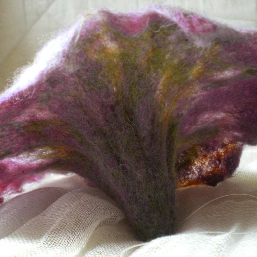 I decided to try on a small peace of silk. The result is “laisse à désirer” It doesn’ t give the impression airy, light . Like your scarfs. Too felted. You pour hot (very hot?) water directly on wool? How often? How much time you roll? Sorry for questions.