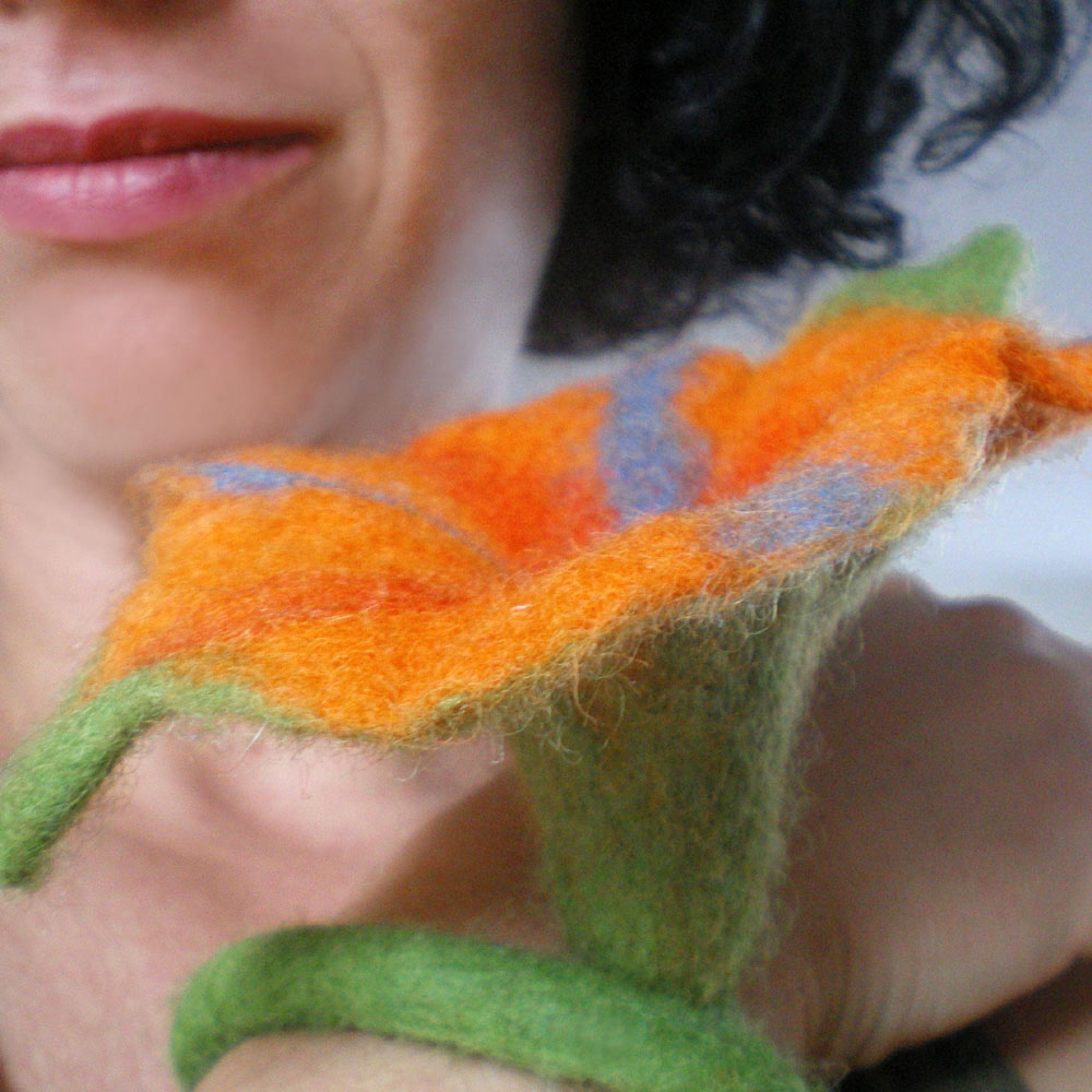 This -you re so vain- brooch is felted using the nuno felt technique. It is hand felted all together in 2 layers with merino wool from New Zealand in violet, orange and green, cotton in light orange and mulberry silk in green. No “felt cutting ready-made flower”, no glue and no stitches, except on its back on which a safety pin is adjusted and felted over with green wool. The flower measures approximately 20cm (7.9 in) height, 14-9cm (5.5-3.5 in) length and 12 cm (4.7 in) width.