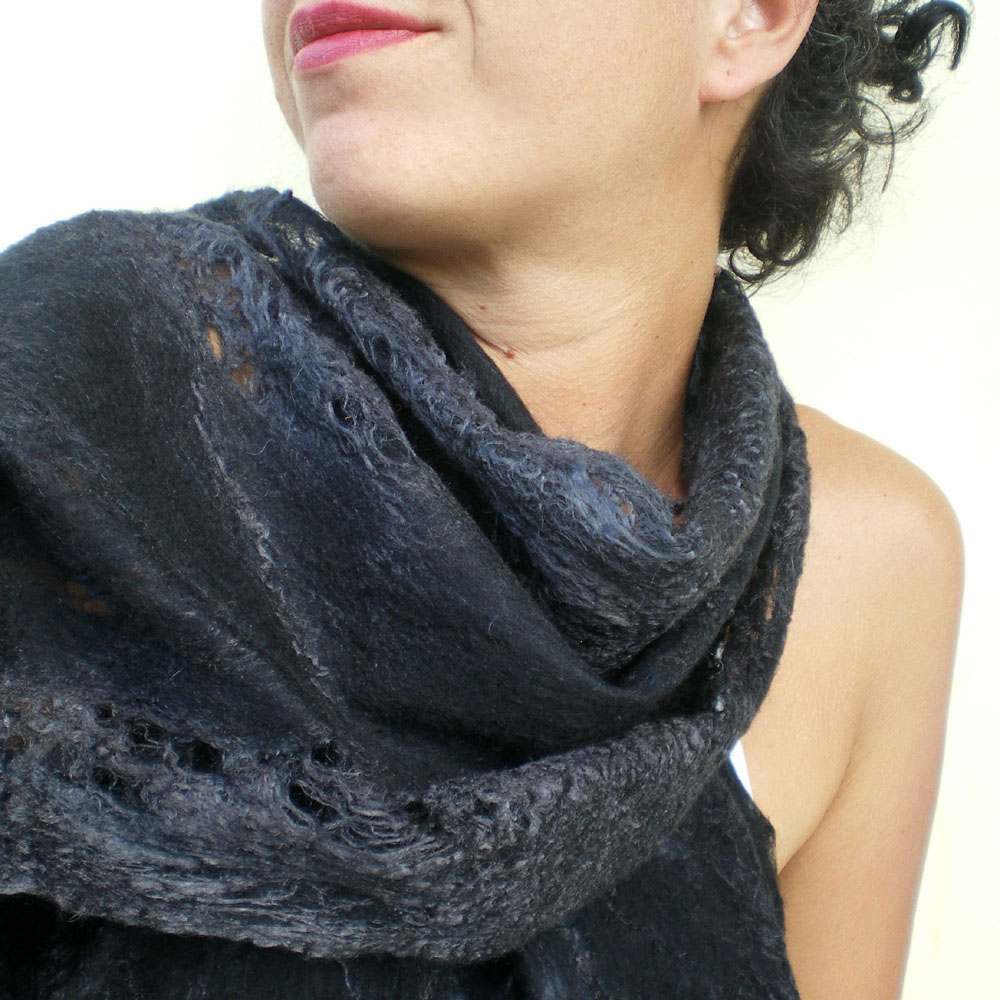 This breezy and loose scarf is made with the cobweb felt technique, thus most of its parts are transparent with some small holes. This is the fascinating part of the cobweb felt which makes it unique.