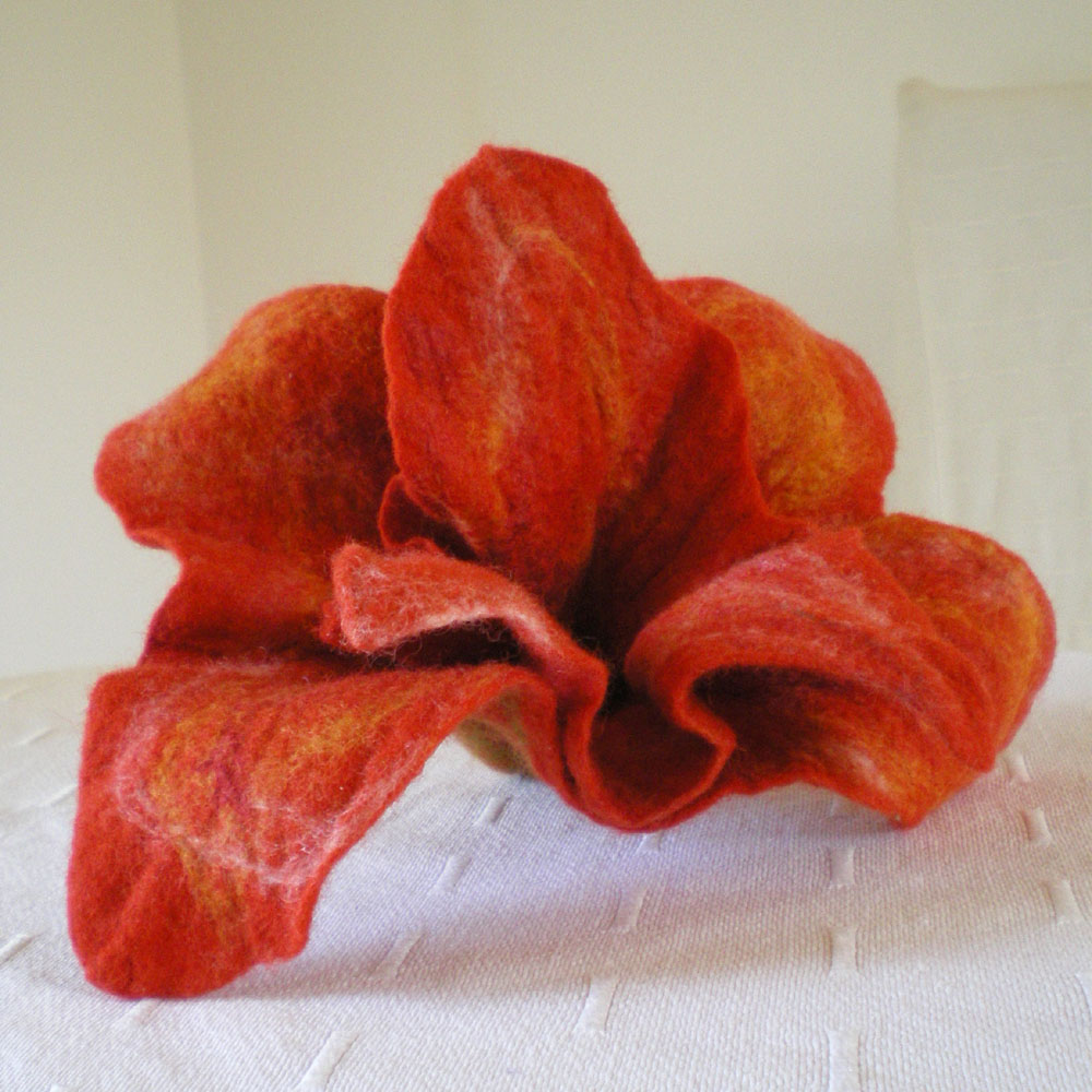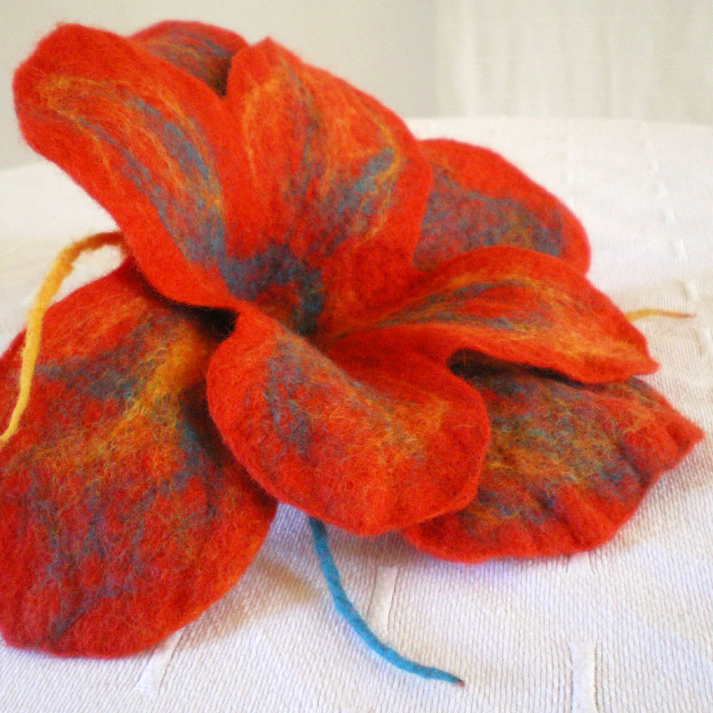 felted flower brooch -wild orchid- felted flower brooch -wild orchid-This –wild orchid- flower brooch is hand felted all together in 2 layers with extra-fine merino wool from New Zealand and Australia in orange, yellow, deep red and green colors. Also mulberry silk in blonde yellow is used to brighten up the flower. No “felt cutting ready-made flower”, no glue and no stitches, except on its back on which a safety pin is adjusted and felted over with green wool. The flower measures approximately 13-23 cm (5.1-9.1 in) diameter since it is asymmetrical and 55 cm (21.7 in) circumference.