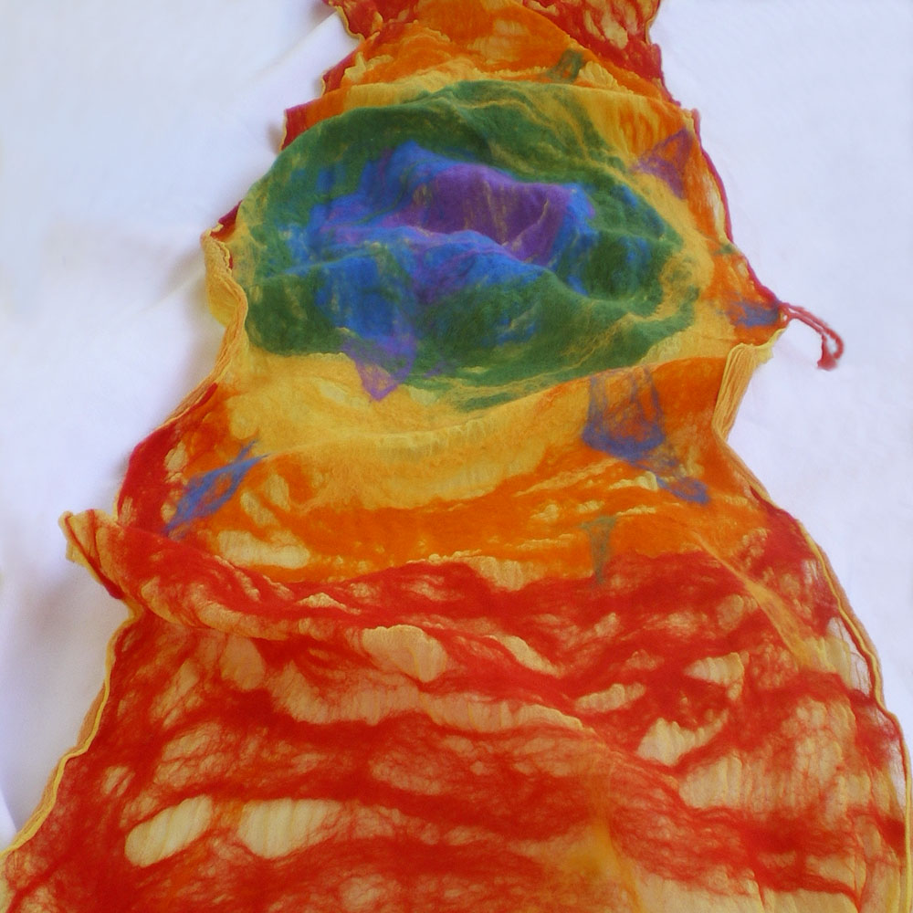 • Thank you very much for quick answer. Photos are interesting and help to understand something, even for the beginner in wet felting like me. You are the real artist! What a sense of colors! When you make your rainbow scarf your clothes are the same color range. And i like poems which accompany scarfs .Good luck and a lot of inspiration!