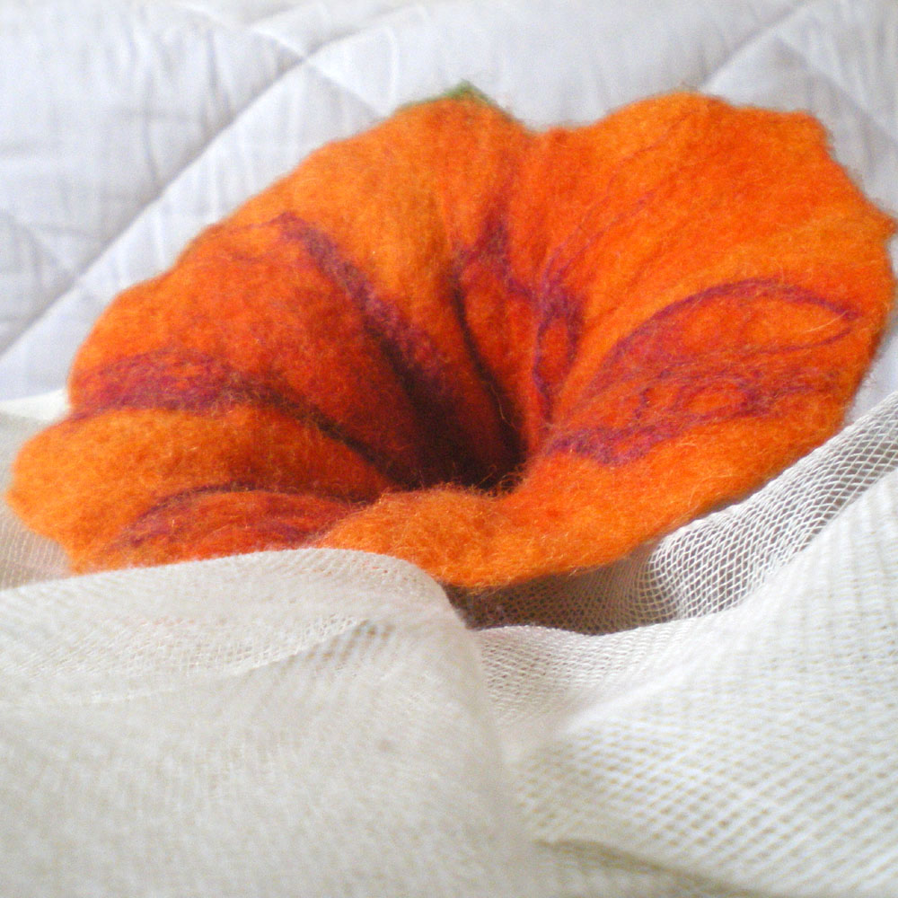 This lovely -whisper me- flower brooch is felted with merino wool from New Zealand in orange and green and is decorated with mulberry silk threads in dark red. The flower measures approximately 12-14 cm (4.7-5.5 in) diameter and 9 cm (3.5 in) width.