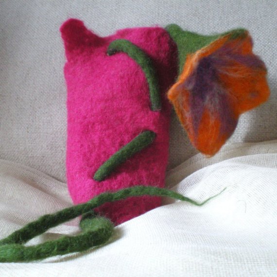 This small mobile phone case is felted with merino wool from New Zealand in dark pink. It is decorated with a small orange flower (again from merino wool in orange, violet and green colours) which is also used to close the case. The flower is attached on the case through some holes and its stalk goes in and out on the case´s back part.