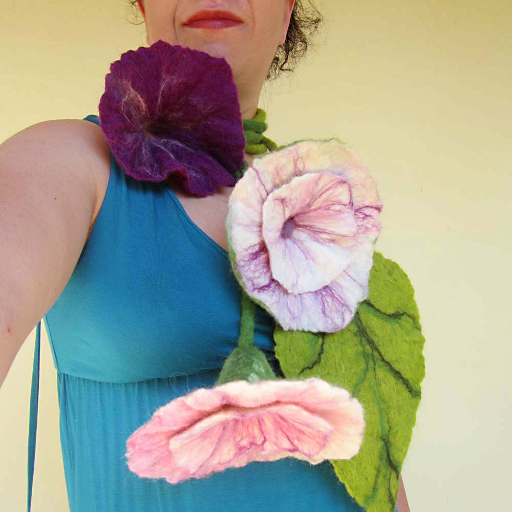 The necklace consists of 3 felted flowers and a leaf in a variety of colors. All of them are hand felted using the wet felting technique with extra-fine merino wool from Australia and South America (18-23 mic). The colors range from violet to white including purple, pink, lilac and the two stalks are made in leaf green and apple green colors.