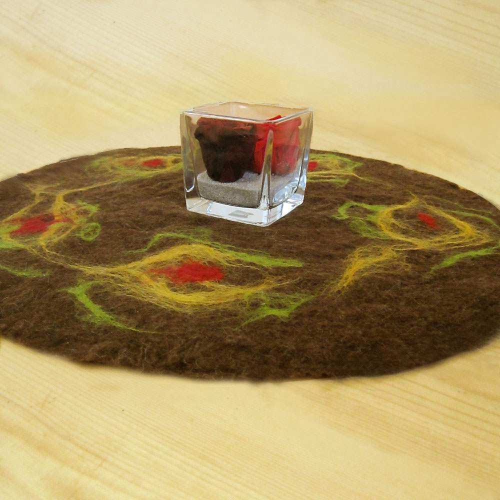 This table runner is hand-felted with extra fine merino wool (18mic) in red, yellow, green colors and mountain sheep wool in natural brown color. It is made with the wet felting technique and it measures approximately 57 cm (22.45 in) diameter and 174 cm (68.5 in) circumference.