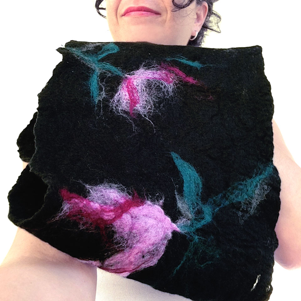 The neck warmer is made of extra fine merino wool from Australia (18 mic) in black color and decorated also with extra fine merino wool from Australia in a punch of colors; purple, pink and dark green. It fits all sizes and it measures approximately 34 cm (13.3 in) width and 24 cm (9.4 in) height.